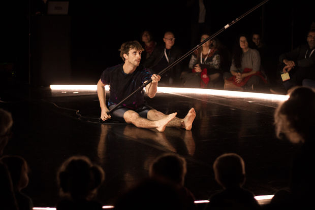 A circular and empty space. A body, a microphone, speakers, spotlights, and lines of light take center stage in this contemporary circus performance. Through gesture, sound, gaze, or touch, the audience is invited to take part in this journey full of acrobatics, humor, play, light, and music.